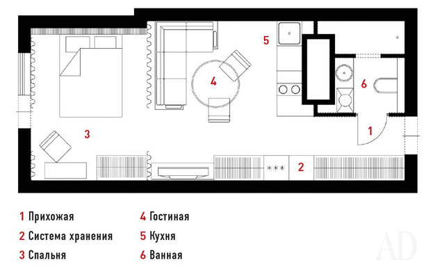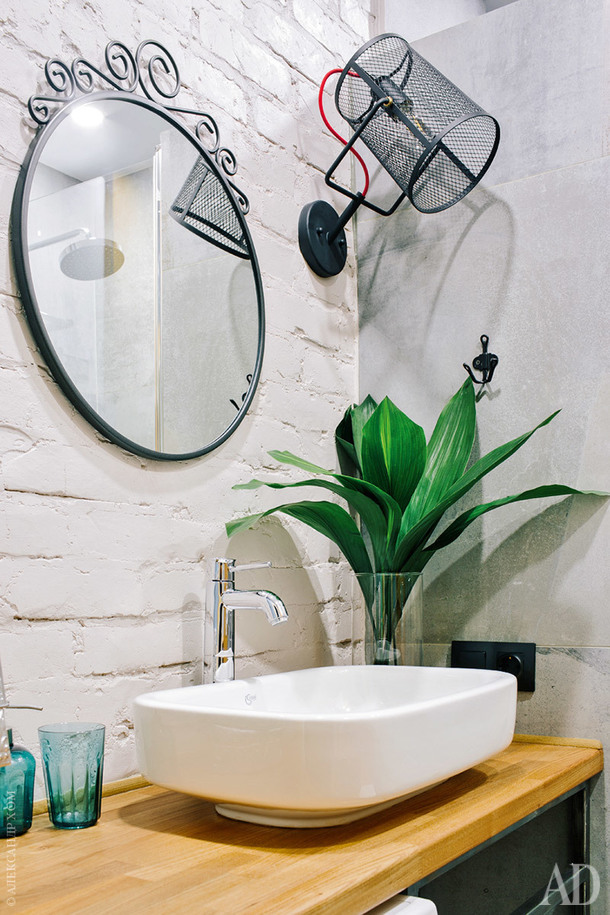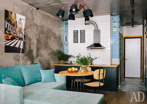 Интерьер квартиры-студии в новостройке площадью 32 кв.м. и потолками 2,70 м. выполнен с элементами стиля лофт. Квартира так называемый «стакан» с одним окном. Отделку сделана максимально “натурально”: бетонный потолок и все стены. Между санузлом и общим пространством проходит вентиляционная шахта в кирпичном коробе. Его зачистили, покрасили и тоже оставили на виду. В каждой функциональной зоне свои источники света, но в ванной они из одной серии, чтобы поддержать стилистическое единообразие всего интерьера.