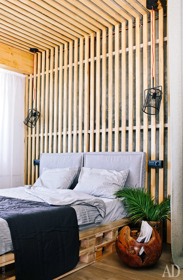 Даже в маленькой квартире очень хочется иметь полноценную спальную зону с кроватью, а не раскладным диваном. Спальню было решено оформить деревом: кровать поместили в короб из палет, стены декорировали рейками. За реечным изголовьем скрыты трубы отопления, которые идут к радиатору под окном. Они же натолкнули дизайнера на мысль убрать электрические кабели от розеток и светильников в медные трубки. От общей зоны кровать отделяют плотные шторы. Шторы не защищают от шума, но хорошо занируют пространство и делают интерьер более уютным. Консоль в ногах кровати может быть рабочим местом или туалетным столиком.