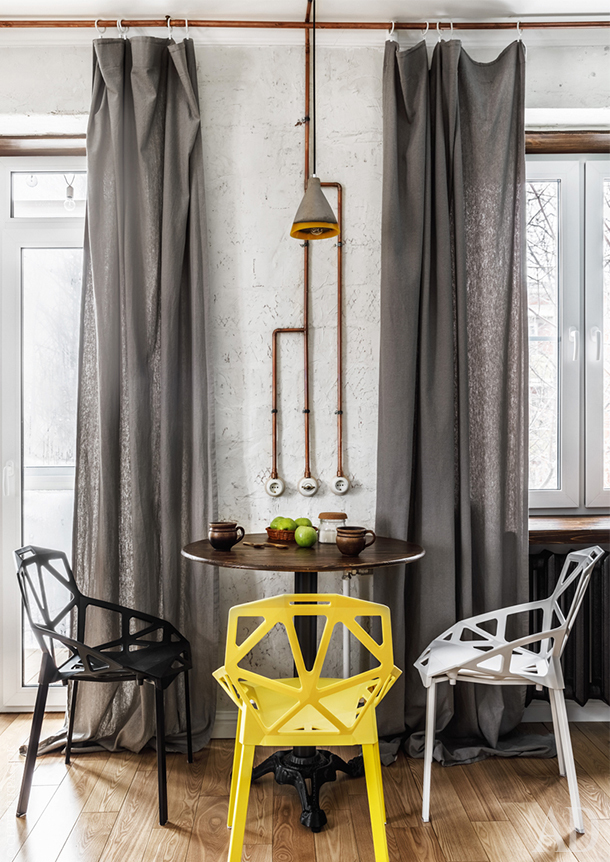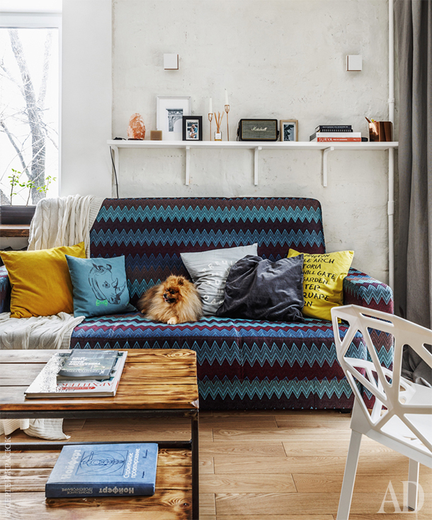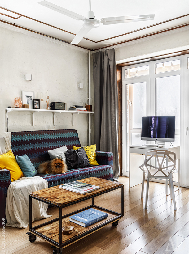 Ремонт начался с того, что Уткины зачистили квартиру до голых стен. И решили оставить их кирпичными. Но пористый силикатный кирпич сам по себе выглядел не очень нарядно, так что Михаил с Викторией решили поэкспериментировать и покрыли его слоем затирки для кафеля. Ее, кстати, легко мыть. Чтобы подчеркнуть фактуру кирпича, на стене повесили декоративные светильники. А вообще свет в квартире очень минималистичный — представлен в основном софитами направленного действия. Стены предопределили остальные стилистические решения в духе лофта, например, открытую проводку и мебель из фактурного дерева. Доски, как шутят хозяева, выбраны под цвет домашнего любимца, шпица Шона. Впрочем, собака действительно хорошо вписалась в интерьер. Шон не любит собачьи лежанки и устроил себе домик в складках ниспадающей на пол шторы. Хотя раскладной диван в гостиной зоне тоже не обходит своим вниманием.