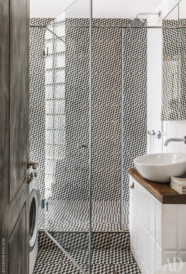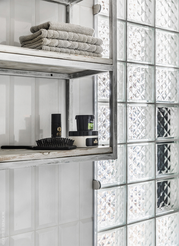 Уткины решили, что просторная душевая лучше, чем стандартная ванна. Чтобы впустить в санузел естественный свет, одну из перегородок сложили из стеклоблоков. Полка с металлическим каркасом сделана по эскизам дизайнеров. Железная рама покрыта краской неравномерно и местами начала ржаветь. Этого Уткины и ждали — они покрыли лаком окисленные участки и получили вещь с эффектом старения.