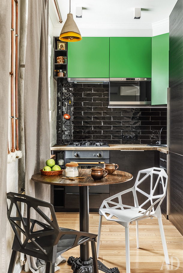 Кухня осталась на прежнем месте, но после того, как новые хозяева снесли внутренние перегородки, стала выглядеть просторней. Изначально Уткины хотели сделать зону готовки темной, чтобы она растворялась в интерьере. Но потом решили добавить в интерьер яркого цвета и сделали верхние шкафчики зелеными, чтобы они гармонировали с деревьями за окном и зеленью на столе.