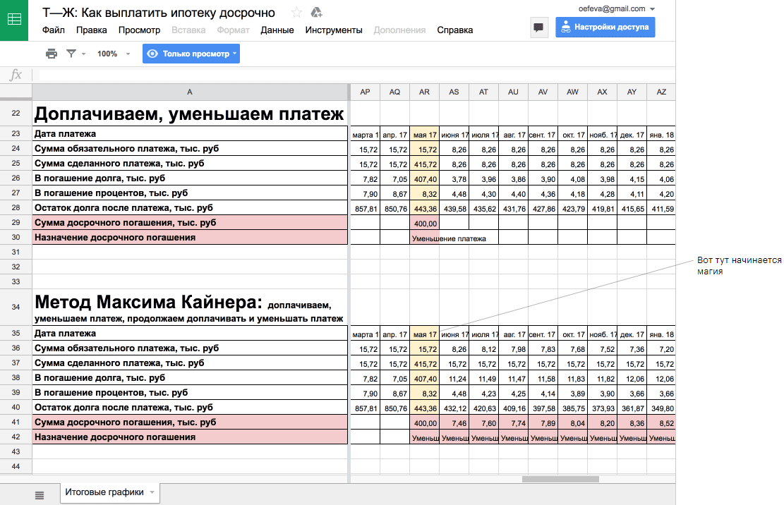 Я понимаю, что это трудно понять в тексте, поэтому подготовил для вас табличку. Там четыре варианта погашения кредита, мой — последний. Проматывайте до столбца AR, где я вношу досрочно 400 тысяч, и смотрите на математическую магию.