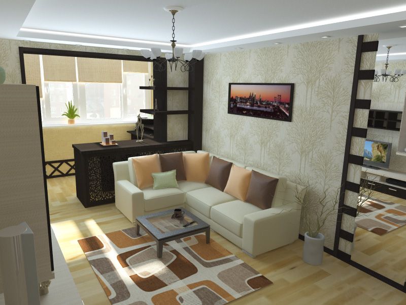 Довольно органично смотрятся объединенные гостиная и балкон. Для этого не нужно нарушать закон, снося несущие стены. Достаточно убрать окно и двери, утеплить балкон, соорудить столешницу и полки.