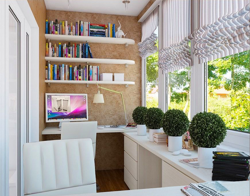 Деловые люди могут использовать балкон в качестве кабинета. Небольшая столешница вдоль окна, полки с книгами и компьютер – вот и готов уютный домашний офис, в котором время от времени захочется отвлекаться от работы и радоваться огням большого города.