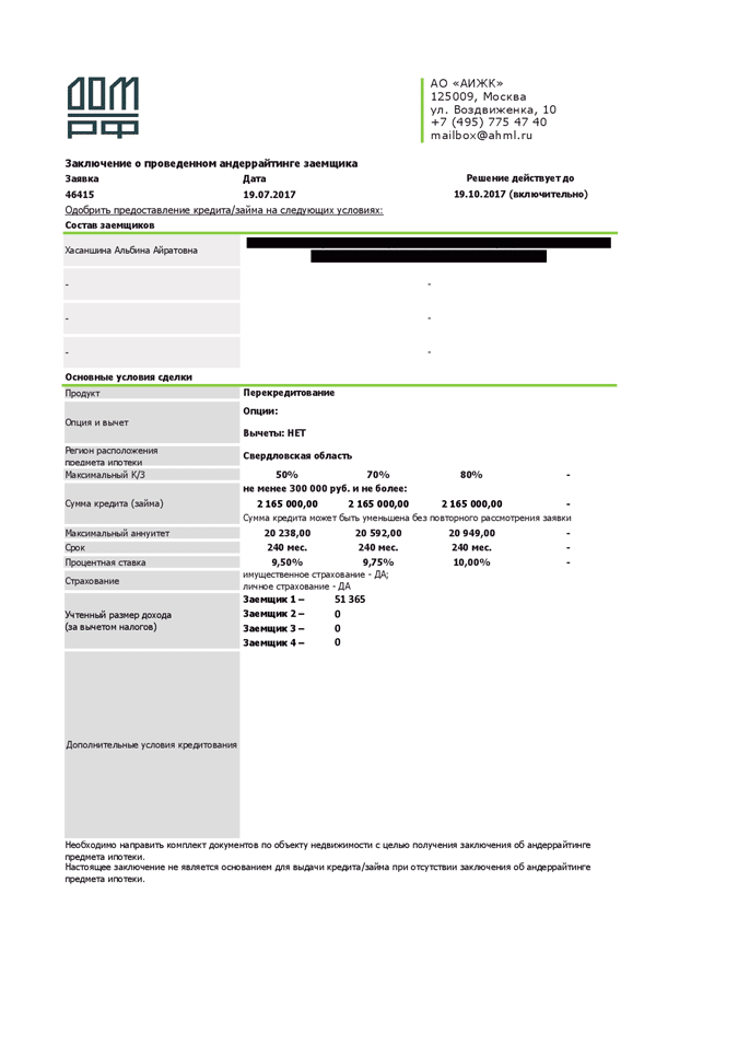 Заключение об одобрении кредита. У банка я попросила 65% стоимости квартиры под 9,75% годовых.