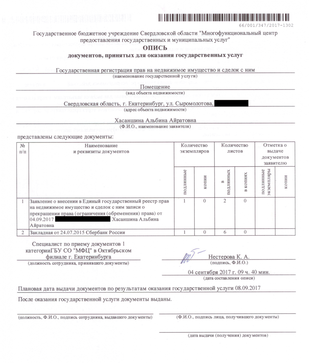 Вместе со специалистом из нового банка я пошла в МФЦ, показала закладную с отметкой и написала два заявления: на снятие обременения и наложение нового обременения. Предоставила сведения о квартире и заплатила госпошлину 500 рублей. Через неделю квартира перешла в залог новому банку.