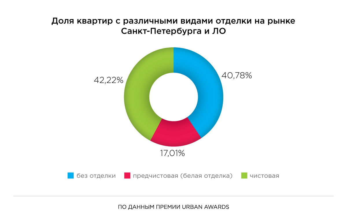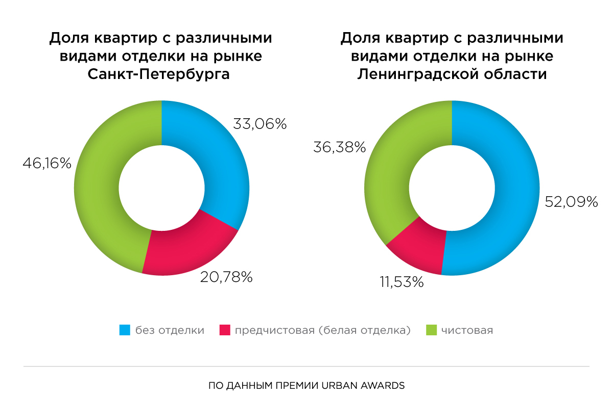 Суммарно на рынке первичного предложения жилья Санкт-Петербурга доля квартир с чистовой отделкой занимает 46,16%. Ещё 20,78% лотов предлагается с предчистовой (белой) отделкой. В то же время без отделки предлагается всего 33,06% от реализуемых квартир.