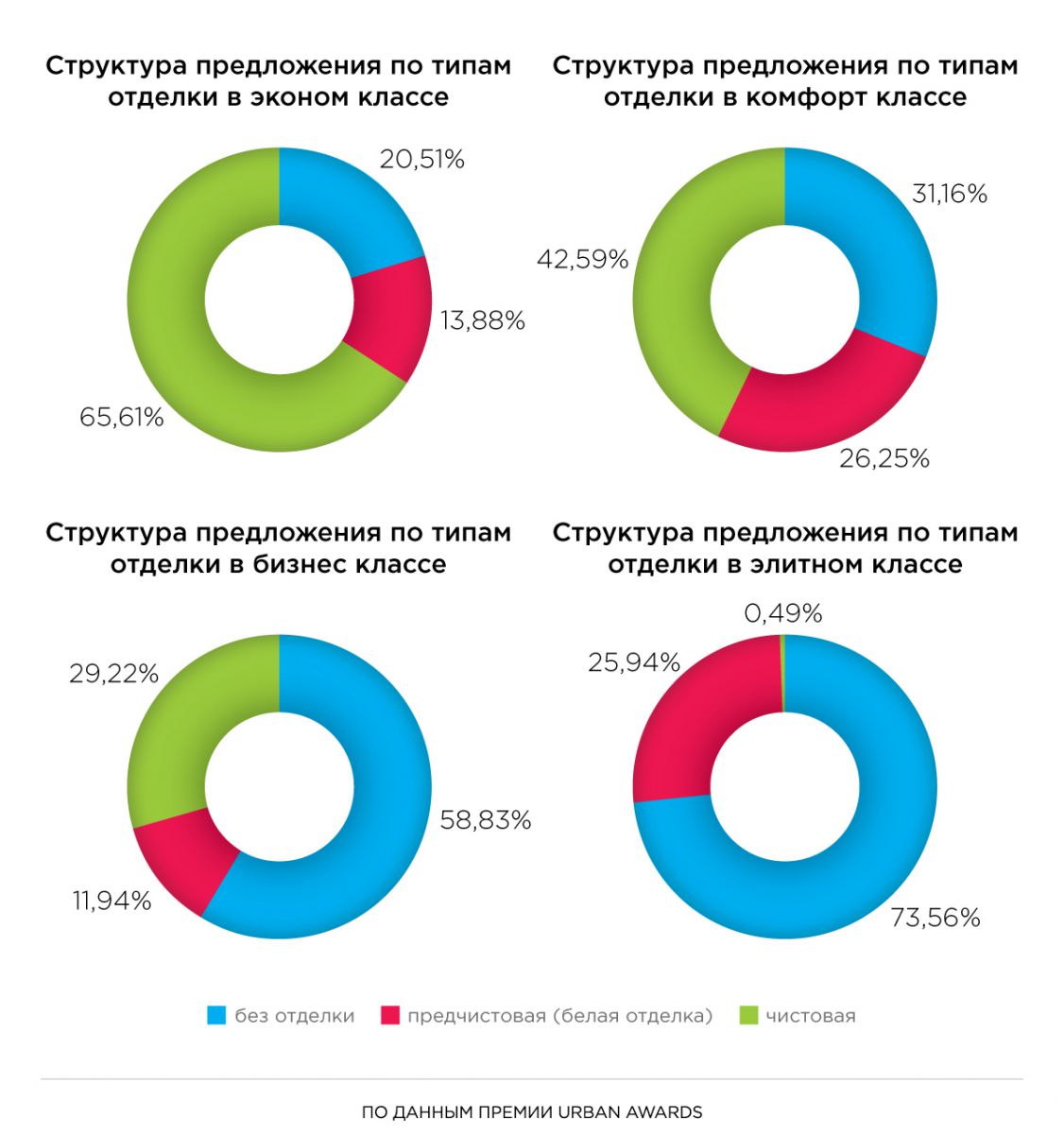 Самый сбалансированный объем предложения наблюдается в комфорт-классе. Различные варианты отделки в таких проектах распределены не так неоднородно как в других сегментах рынка. Квартиры с белой отделкой здесь занимают 26,3%, с чистовой — 42,59%, а без отделки — 31,16%.