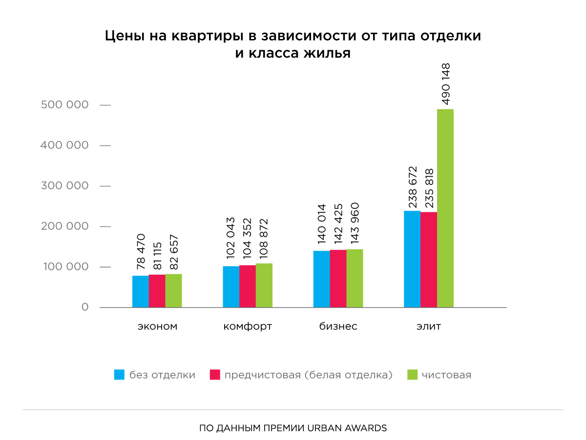 Вариации предлагаемой отделки влияют и на уровень конечной стоимость квартир. Вдобавок соотношение стоимости жилья с одинаковыми типами отделки в проектах разных классов сильно отличается. Так, в эконом-классе стандартная разница между квартирой с черновой и чистовой отделкой находится на уровне в 4 тыс. рублей за 1 кв. м. При этом в комфорт-классе эта разница увеличивается и достигает уже порядка 6,8 тыс. рублей за 1 кв. м.