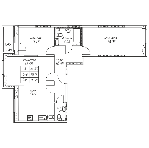 Общая площадь - 76.56 кв.м