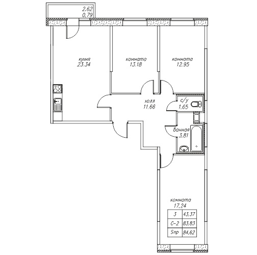 3-комнатная квартира, 84.62 кв.м, 2 этаж — 6 246 225 руб. (73 815 руб./м2)