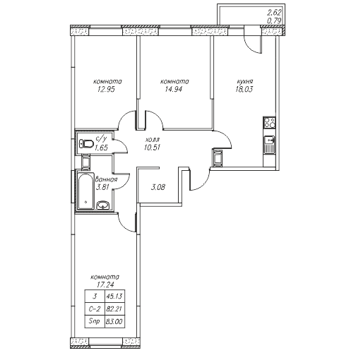 3-комнатная квартира, 83 кв.м, 4 этаж — 6 173 955 руб. (74 385 руб./м2)
