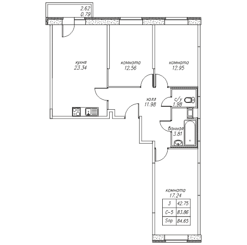 Общая площадь - 84.65 кв.м
