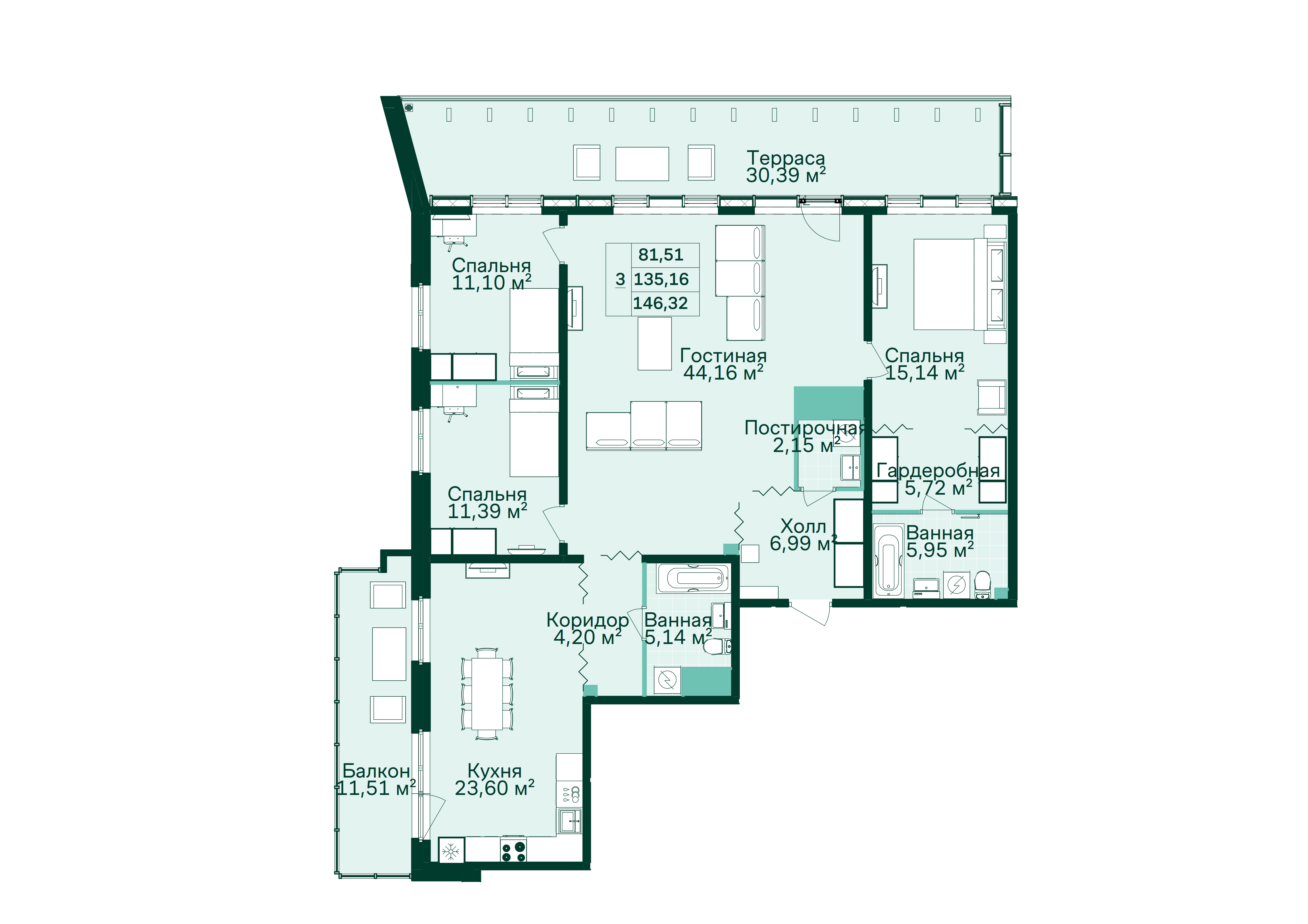 Жилая - 81.79 кв.м, Кухня - 23.6 кв.м
