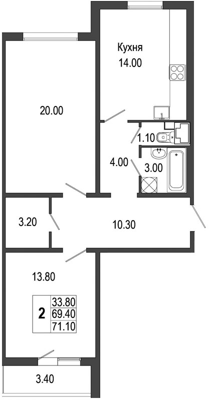 Жилая - 33.8 кв.м, Кухня - 14 кв.м