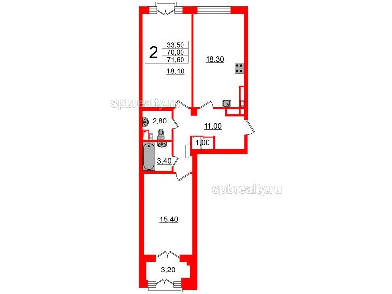 Жилая - 33.5 кв.м, Кухня - 18.3 кв.м