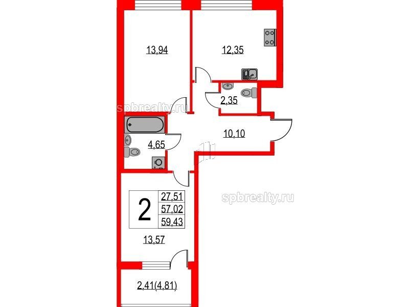 Жилая - 27.51 кв.м, Кухня - 12.35 кв.м