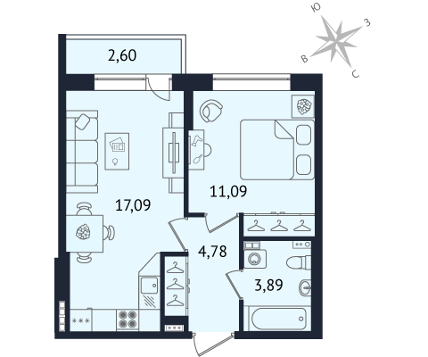 Жилая - 11.09 кв.м, Кухня - 17.09 кв.м