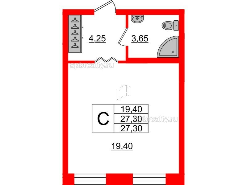 Общая площадь - 27.3 кв.м