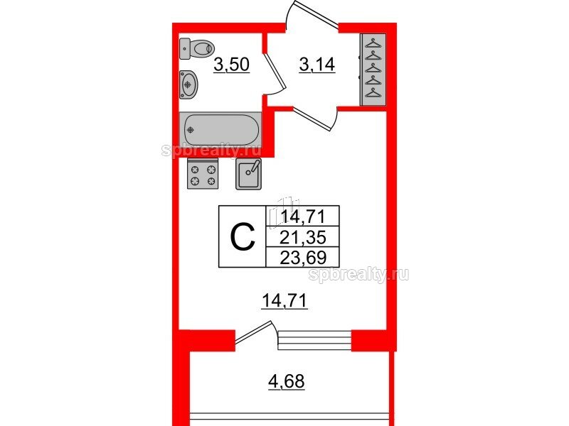 Общая площадь - 23.69 кв.м