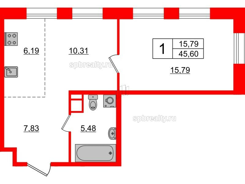 Общая площадь - 45.6 кв.м