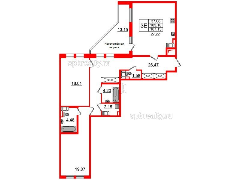 Жилая - 37.08 кв.м, Кухня - 27.22 кв.м