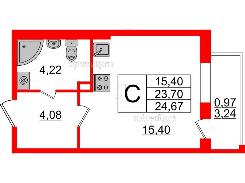 Общая площадь - 24.67 кв.м