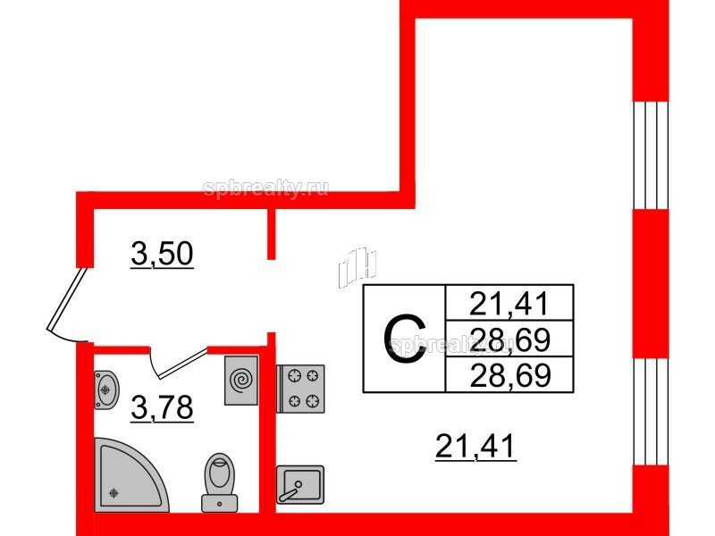 Общая площадь - 28.69 кв.м