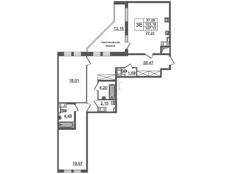 Жилая - 37.08 кв.м, Кухня - 27.22 кв.м