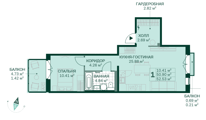 Жилая - 10.41 кв.м, Кухня - 25.88 кв.м