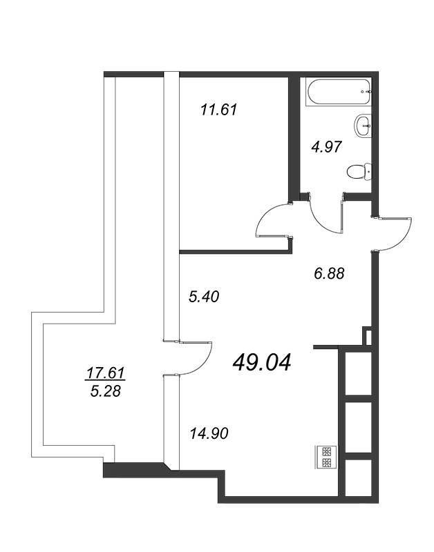 Жилая - 26.51 кв.м, Кухня - 5.4 кв.м