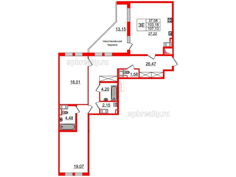 Жилая - 37.08 кв.м, Кухня - 27.22 кв.м