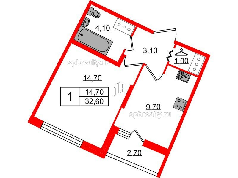 Жилая - 14.7 кв.м, Кухня - 9.7 кв.м
