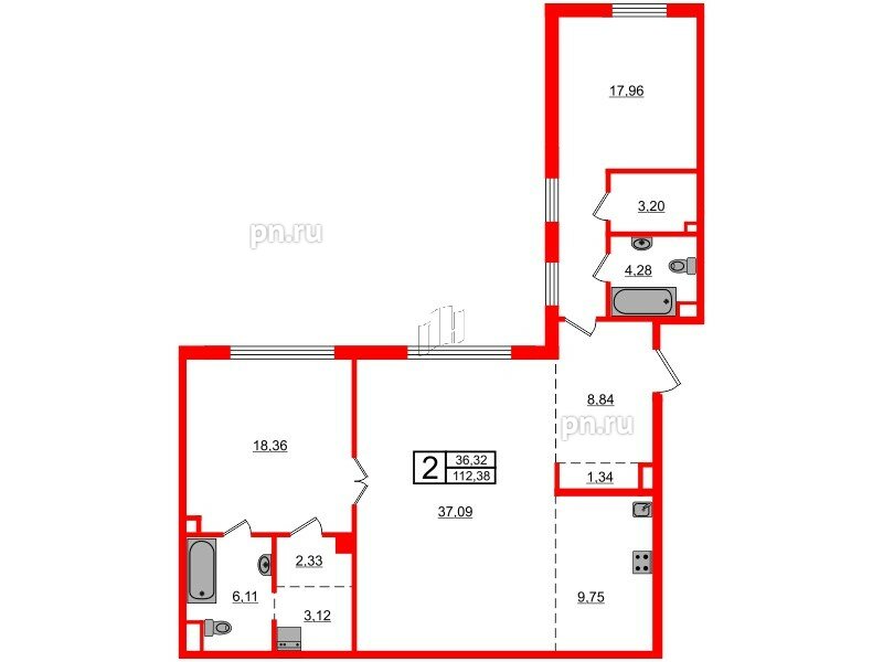 Площадь комнат - 36.32 кв.м