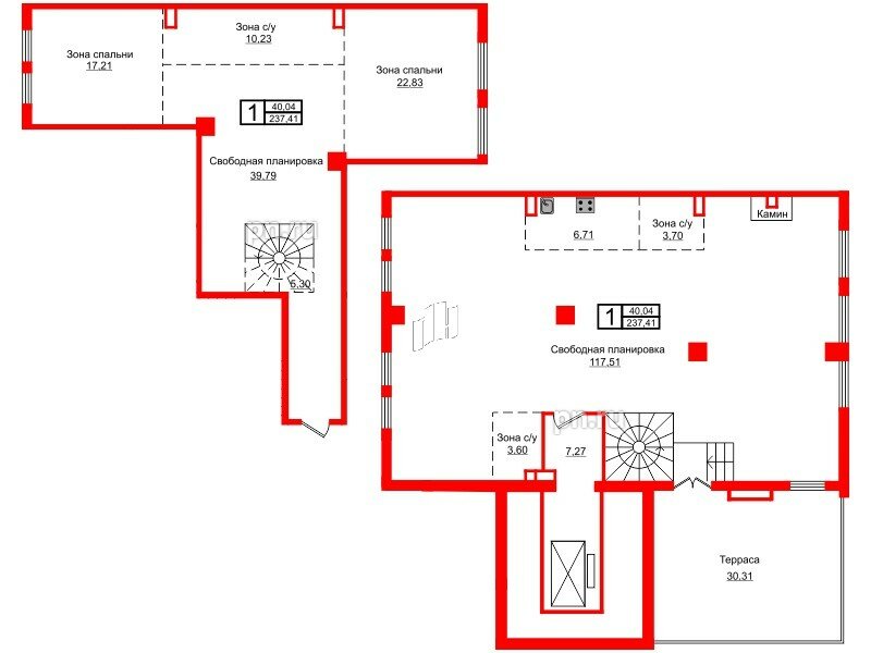 Жилая - 40.04 кв.м, Кухня - 39.79 кв.м