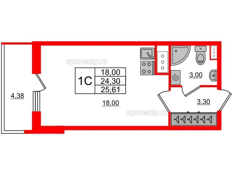Общая площадь - 24.3 кв.м