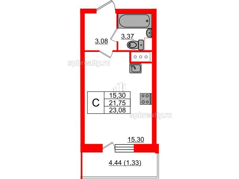 Общая площадь - 23.08 кв.м