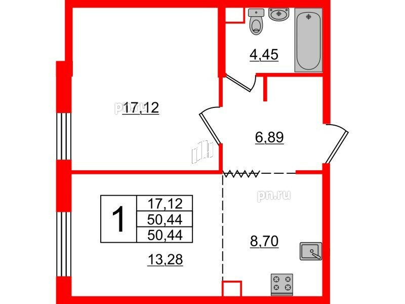 Общая площадь - 50.44 кв.м