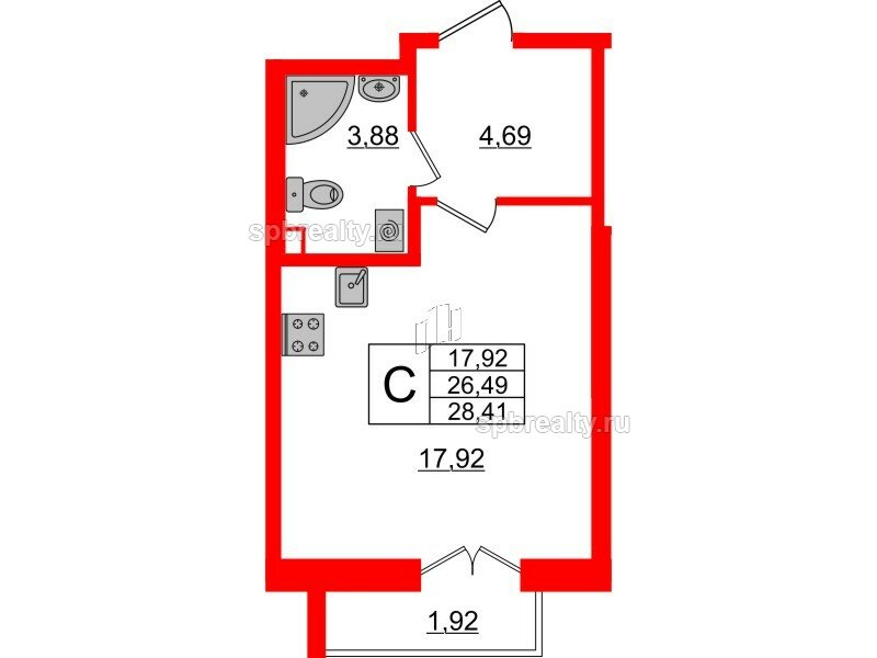 Общая площадь - 26.49 кв.м