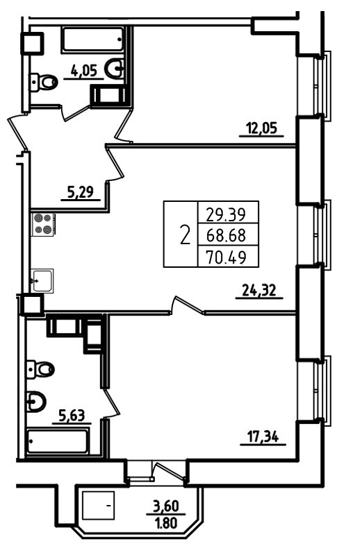 Жилая - 29.39 кв.м, Кухня - 24.32 кв.м
