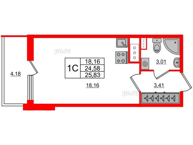 Общая площадь - 24.58 кв.м