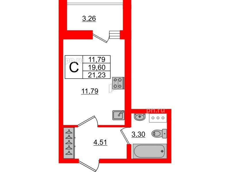 Общая площадь - 21.23 кв.м