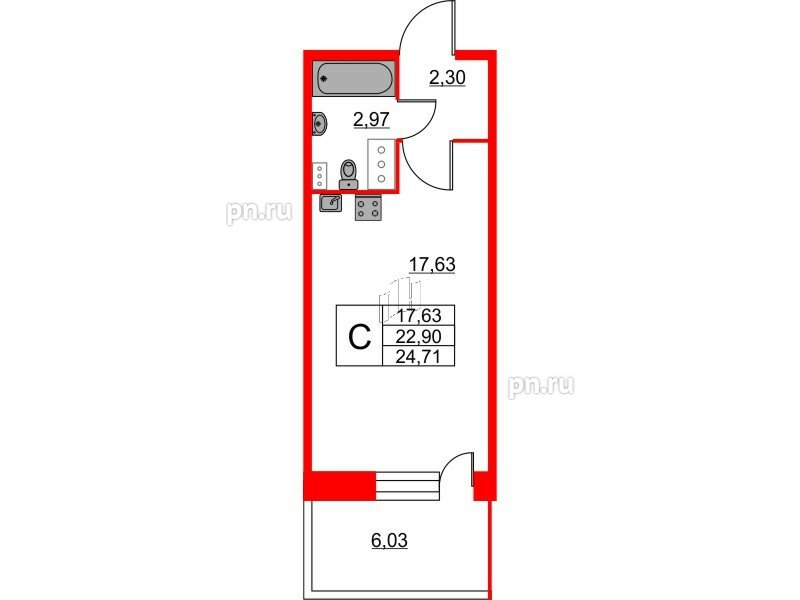 Общая площадь - 24.71 кв.м