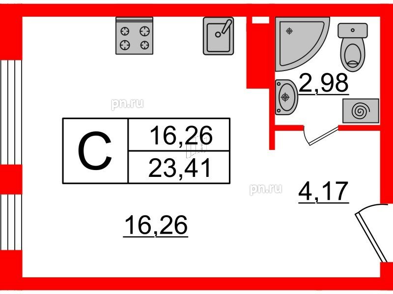 Общая площадь - 23.41 кв.м