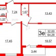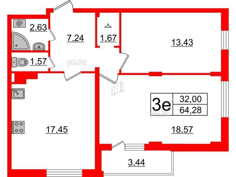 Жилая - 32 кв.м, Кухня - 17.45 кв.м