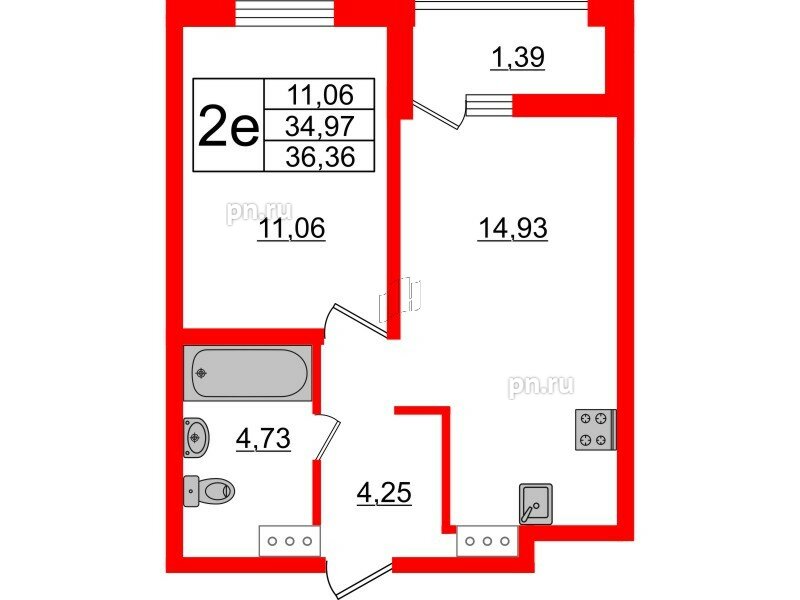 Жилая - 11.06 кв.м, Кухня - 14.93 кв.м