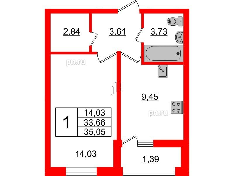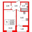 Жилая - 14.03 кв.м, Кухня - 9.45 кв.м