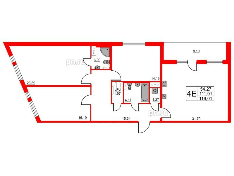 Жилая - 54.27 кв.м, Кухня - 31.79 кв.м