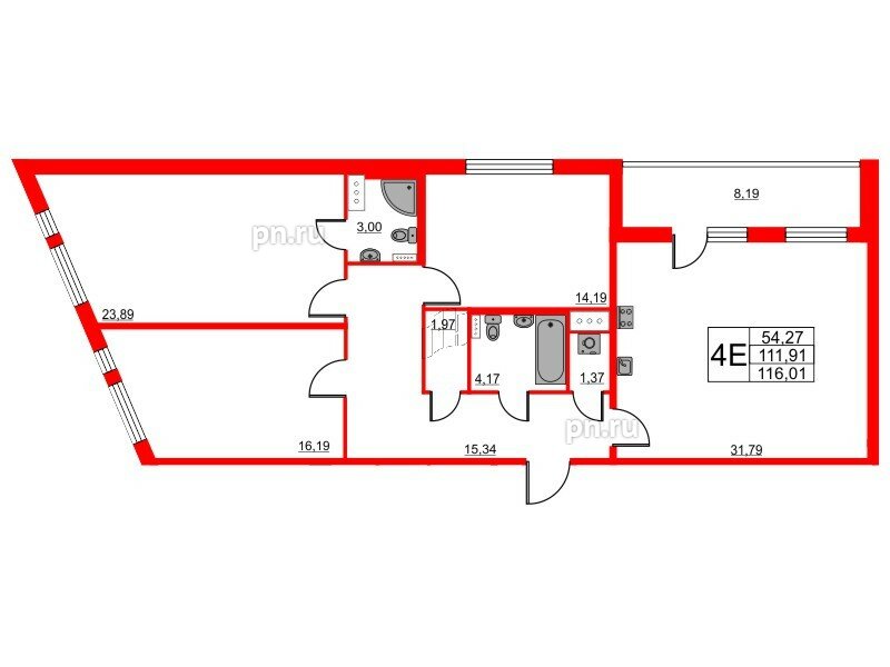 Жилая - 54.27 кв.м, Кухня - 31.79 кв.м