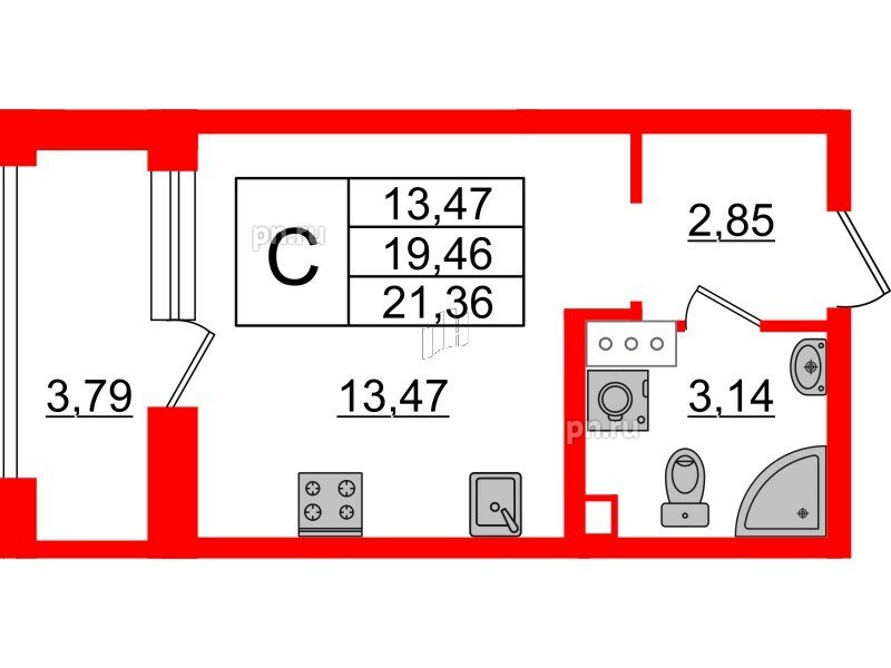 Общая площадь - 21.36 кв.м